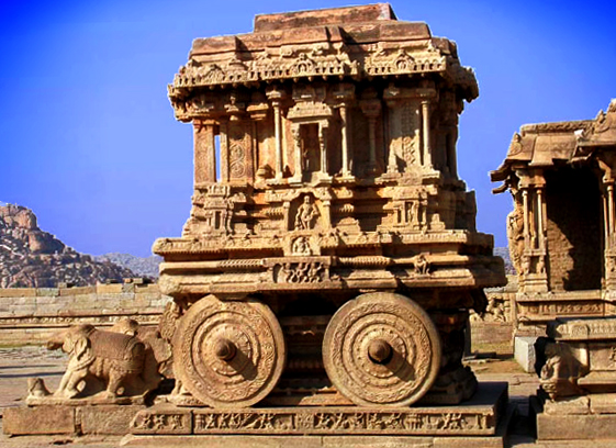 Located on the southern banks of the Tungabhadra River, the Vithala temple is another imposing structure amidst the ruins. The large Ranga Mantapa of the temple has 56 musical pillars that resound with musical notes when struck. In the temple courtyard stands a magnificent stone chariot, so perfectly proportioned that the stone wheels actually rotate.